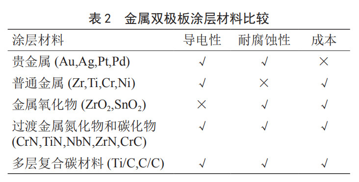 金屬是電與熱的良導(dǎo)體,其作為雙極板材料得到越來越普遍的應(yīng)用,尤其是車輛空間限制(如乘用車),要求燃料電池具有較高的功率密度。薄金屬雙極板以其可以實(shí)現(xiàn)雙極板的薄型化及本征的優(yōu)良導(dǎo)電特性,成為了提高燃料電池功率密度的首選方案;目前各大汽車公司大都采用金屬雙極板技術(shù),如豐田汽車公司、本田株式會社、現(xiàn)代汽車有限公司等。金屬雙極板技術(shù)挑戰(zhàn)是其在燃料電池環(huán)境下(酸性、電位、濕熱)具有耐腐蝕性且對燃料電池其他部件與材料的相容無污染性。目前常用的金屬雙極板材料是帶有表面涂層的不銹鋼或鈦材。針對燃料電池不銹鋼雙極板表面耐腐蝕涂層技術(shù),國內(nèi)外進(jìn)行了大量的學(xué)術(shù)研究工作,其涂層材料要保證耐腐蝕、導(dǎo)電兼?zhèn)湫阅埽硇缘耐繉硬牧先绫?所示。總體來說,表面涂層材料可以分為金屬、金屬化合物與碳涂層三類;金屬類包括貴金屬以及金屬化合物。貴金屬涂層,如金、銀、鉑等,盡管成本高,但由于其優(yōu)越的耐蝕性以及與石墨相似的接觸電阻使其在特殊領(lǐng)域仍有采用。為了降低成本,處理層的厚度盡量減薄,但是要避免針孔。金屬化合物涂層是目前研究較多的表面處理方案,如Ti-N,Cr-N,Cr-C 等表現(xiàn)出較高的應(yīng)用價(jià)值。除了金屬類涂層以外,在金屬雙極板碳類膜方面也有一定探索,如石墨、導(dǎo)電聚合物(聚苯胺、聚吡咯)以及類金剛石等薄膜,豐田汽車公司Ce2O3H2O的專利技術(shù)(US2014356764)披露了具有高導(dǎo)電性的 SP2 雜化軌道無定型碳的雙極板表面處理技術(shù)。