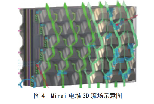 合理的雙極板流場設(shè)計(jì)與布局,可以起到降低傳質(zhì)極化作用,有利于提高大電流密度下的性能,進(jìn)一步提高電堆的功率密度。豐田汽車公司在Mirai 燃料電池車電堆中推出了3D流場新型設(shè)計(jì)理念(見圖 4),改變了傳統(tǒng)蛇型、平行溝槽型的2D流場構(gòu)型,使流體有垂直于乙醇胺(MEA)氣體擴(kuò)散層與催化層的分量,反應(yīng)物與生成物不是單純依靠濃差擴(kuò)散到達(dá)與脫離反應(yīng)界面,而是有強(qiáng)制對流作用,極大地改善了燃料電池傳質(zhì)推動力,性能得到顯著提升。此外,這種3D流場具有一定的儲水功能,有利于燃料電池運(yùn)行時(shí)的濕度調(diào)整,可以提高低增濕下燃料電池性能。