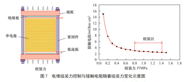 除了用高度控制來獲得電堆最佳組裝匹配外,還可以采用組裝力控制法確定電堆部件之間的良好匹配關(guān)系。組裝力可以通過組裝機(jī)械如油壓機(jī)實(shí)施,隨著組裝力加大,雙極板與 MEA 間的接觸逐漸減少,當(dāng)達(dá)到平緩區(qū)即為最佳的組裝力控制區(qū)(見圖7),通常接觸電阻與組裝力的關(guān)系可以在電堆組裝前通過單電池試驗(yàn)離線獲得,并確定接觸電阻達(dá)到較小狀態(tài)對應(yīng)的組裝力。