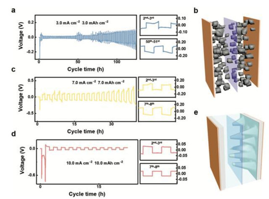 如果我們將電流密度提高(7.0mA/cm2和7.0mAh/cm2),我們能夠看到電池的循環壽命大幅縮短,而如果我們進一步將電流密度提升(10.0mA/cm2和10.0mAh/cm2),則電池進行幾次循環后就轉變為一個規律的方波電壓圖形,這主要是因為在如此大的電流密度下金屬Li電極表面生成的Li枝晶穿破隔膜,使得正負極短路,從而讓電池轉變為一個純電阻,因此我們能夠看到電池在此時的極化只有20mV左右。