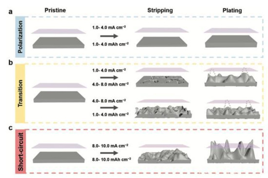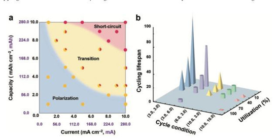 Peng Shi的工作表明金屬Li電極在軟包電池中的行為特性不同于有約束力的扣式電池,在軟包電池中Li金屬負極的失效主要存在3個區間:1)極化區間;2)過渡區間;3)短路區間,而電流密度和面容量密度這兩個參數是三個區間的主要邊界條件,通過選擇合適的邊界條件能夠控制Li電極獲得更好的循環性能,并減少短路的風險。