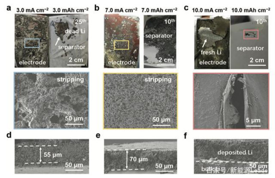 Li電極在不同電流密度下的形貌變化能夠更好的反應不同電流密度下金屬Li電極的失效機理,對于3mA/cm2的電流密度,在循環1次后金屬Li負極表面沒有顯著的變化,在循環5次后能夠明顯的觀察到明顯的死Li的存在,在循環25次后Li電極表面已經覆蓋了一層厚度為55um的死Li,在解剖電池的時候也能夠觀察到部分死Li粘在隔膜上,在經過50次循環后電極就已經完全粉化,死Li層的厚度更是達到了95um。