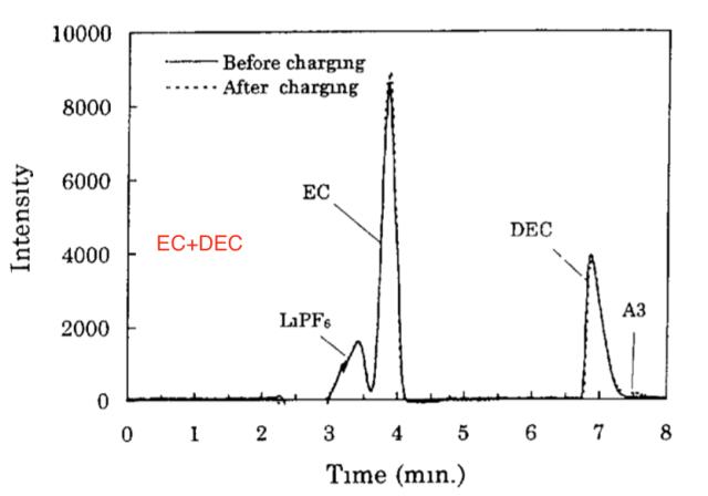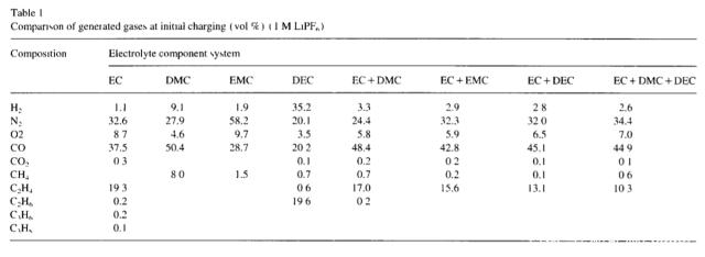 下表為采用不同的電解液體系時電池在首次充電過程中產生的氣體種類,從下表中能夠看到當單獨采用EC或者電解液中含有EC溶劑時我們都能夠在電池產生的氣體中觀察到大量的CO和C2H4氣體,在單獨使用DMC或EMC時我們能夠在電池產生的氣體中觀察到大量的CO和CH4。同時作者還發現,在單獨采用EC溶劑的電解液或含有EC溶劑的電解液時,產氣過程主要發生在開始充電時,表明EC的分解主要發生在開始充電時,但是在DEC溶劑的體系中電池會持續產生含有大量H2的氣體,最終導致電池無法完成充電。