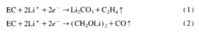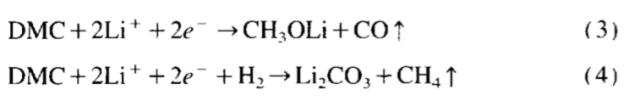 對于EC在負極表面的分解機理,作者認為可能如下式1、2所示,一種反應是EC在負極表面得到兩個電子與Li反應生成Li2CO3和C2H4,還有一種途徑是EC在負極表面得到電子,反應生成(CH2OLi)2和CO,當然我們現在知道EC在負極表面的分解還存在更加復雜的反應機理,生成CH3CH2OLi和CH3OLi等成分,這些成分還會進一步與DMC發生反應,生成EMC、DEC等成分。
