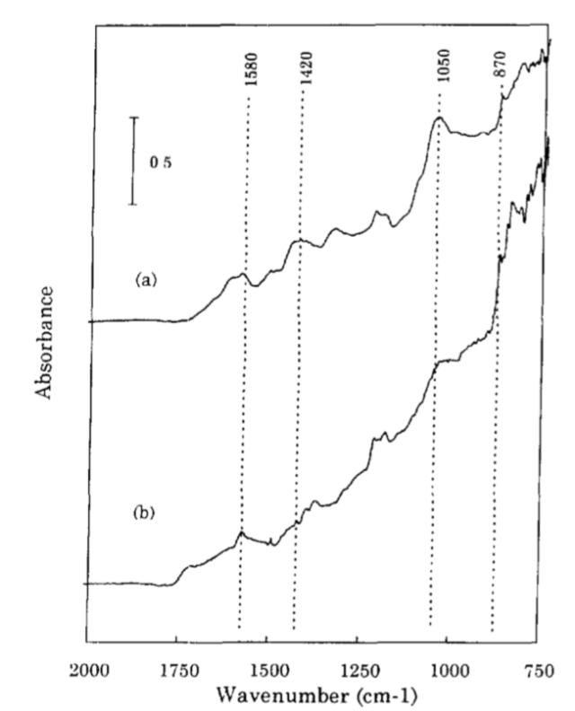下圖為采用純EC溶劑和EC+DMC溶劑的電解液的電池的負極紅外吸收譜圖,從圖中能夠看到兩個負極表面都出現了Li2CO3(1420、870/cm)和RCOOLi(1580/cm)和(CH2OLi)2(1500、1100和890/cm)的吸收峰,這些產物也在其他含有EC溶劑電解液的負極表面觀察到,這也表明在含有EC溶劑的電解液中,主要是EC溶劑在負極表面發生分解。