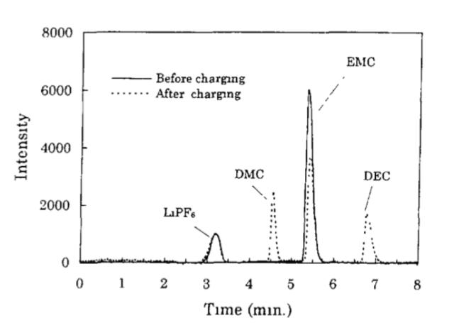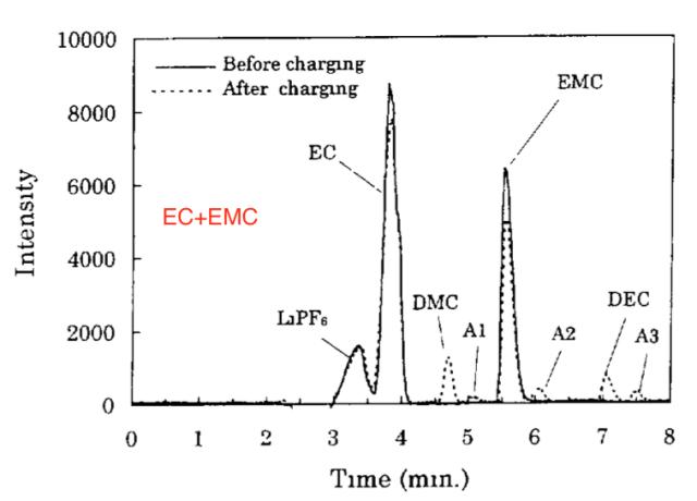 下圖為EC+DMC、EC+DEC和EC+EMC溶劑的電解液在首次充放電前后的氣相色譜圖,從下圖中可以看到在EC+DMC和EC+DEC溶劑的電解液在循環后分別出現了A1和A3成分,A1和A3成分的出現主要是由于EC與DMC、DEC的酯交換反應產生的,當采用EC+EMC溶劑時我們能夠在電解液中發現DMC和DEC的特征峰,這主要是EMC發生了上式5所示的反應,A2成分則主要是由于EC與EMC發生酯交換反應。