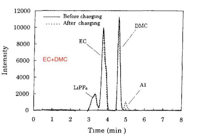 下圖為采用EMC溶劑的電解液在首次充電前后的液相色譜圖,從圖中能夠看到在經過首次充電后EMC的強度明顯降低,但是出現了新的DMC和DEC的峰,同樣的采用DMC和DEC溶劑的電解液在首次充電后我們也能夠探測到EMC的特征峰,這主要是由于三種溶劑具有相似的分子結構,因此相互之間能夠發生轉化。