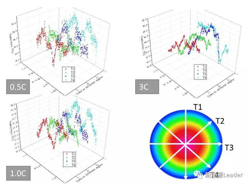 下圖為不同放電倍率放電時,電池在不同角度方向上的溫度分布,從圖中可以看到電池在不同角度方向上也存在散熱的差異,在0.5C較小的倍率下,電池產熱較少,因此不同角度方向的散熱差異比較小,1C倍率下電池的產熱仍然比較小,因此不同角度方向上的溫度差異小于0.1℃,而當電池的放電電流增加到3C后,電池內部的產熱顯著增加,不同方向上的散熱差異變的顯著起來,最大的差別可以達到0.94℃,表明電池在不同角度方向上也存在一定的散熱差異。