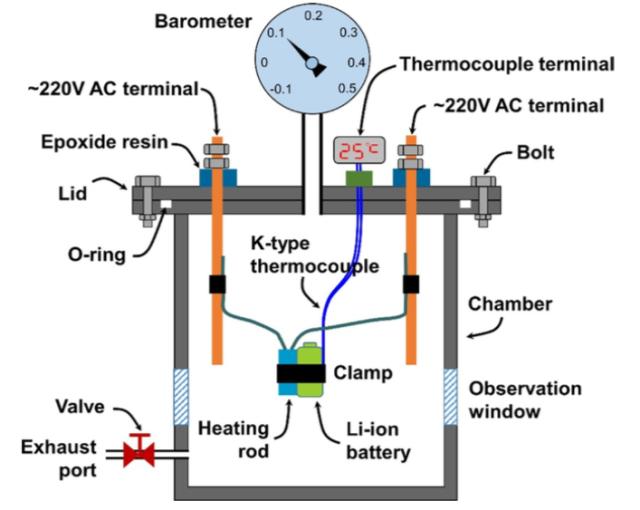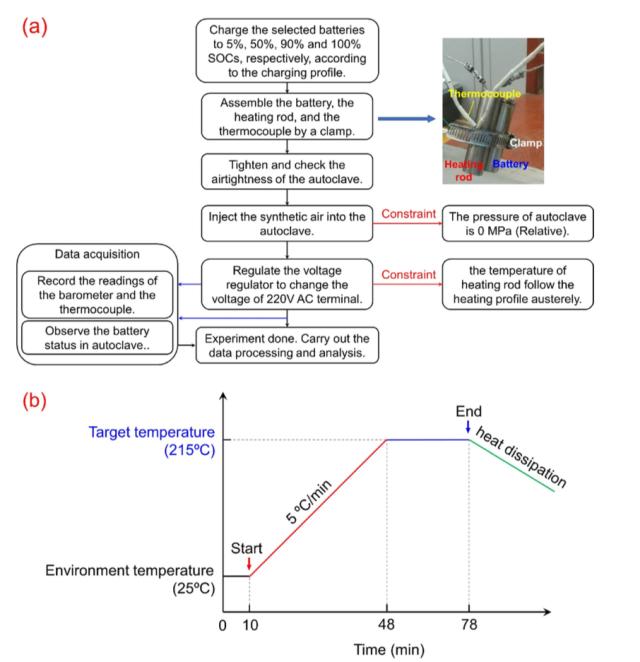 試驗流程如下圖所示,首先將電池的SoC狀態調整到5%、50%、90%和100%SoC,然后將電池、熱電偶和加熱電阻組合在一起,將電池裝入到裝置中后,向其中充入人造空氣(O2:N2=2.1:7.9),然后按照下圖b所示的加熱制度為鋰離子電池進行加熱。