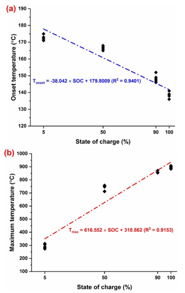 在下圖中作者對不同SoC電池在熱濫用測試中的熱失控起始溫度和最高溫度進行了線性擬合,從擬合結果可以看到隨著電池SoC的升高,電池熱失控的起始溫度出現了線性的降低,熱失控中達到了最高溫度則隨著SoC的升高而增加,表明較高的SoC會導致鋰離子電池的熱穩定性顯著降低。
