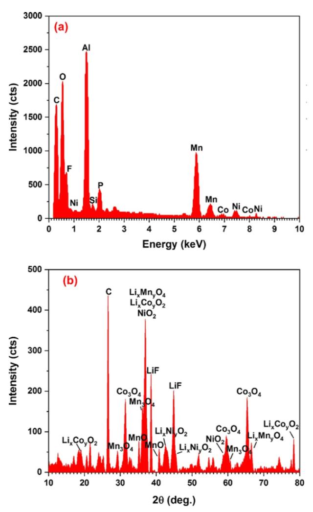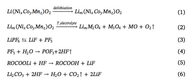 通過XRD分析可以發現,這些顆粒主要成分除了C外,還有鋰/過渡金屬元素的氧化物LixM2O4(M=Co、Ni、Mn),以及過渡金屬氧化物MmOn(M=Co、Ni、Mn),表明這些顆粒中有相當一部分為正極材料的分解產物,試驗數據顯示在熱失控中電池的最高溫度達到了850℃以上,研究表明在這一溫度下,NCM111材料會被分解為無序LixM2O4和M3O4尖晶石結構產物,以及MO巖鹽結構相產物(反應如下式1和2所示)。從下圖b中能夠看到LiF數量也比較多,LiF主要來自于LiPF6在高溫下的分解(反應如下式3-6所示)。