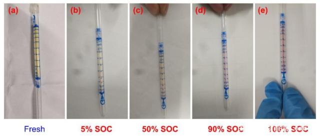 由于傳統的氣質聯用設備無法探測HF氣體,因此作者采用No. 17L GASTEC試紙對電池在熱失控中產生的氣體中的HF的含量進行了檢測,從下圖的檢測結果可以看到,在較高的SoC狀態下熱失控電池產生的氣體中含有數量更多的HF成分(試紙的紅色更深)。