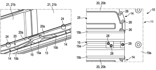 電池系統(tǒng)有點像是PPE平臺的電池方案設計,我們從這個專利里面可以解讀出PPE在之前的E-tron跟MEB平臺設計的差異性——這套電池設計的高度是比較矮的,是適用于轎車的面向高端化的設計構(gòu)思。
