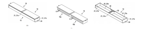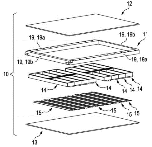 在下面的示意圖中,展示了八個電池模塊(模塊殼體)和(14)八個可彈性變形的元件。這個8個殼體往下細翻,可以看出PPE的模組設計方案,是建立在MEB的590基礎上的,這里設計的思路,是使用兩個橫向分割長度的模組,形成一個一體化結(jié)構(gòu)的長模組設計,長模組之間含有中間隔板,將模組分為前后兩個部分。用專利的說法是,電池長模組包含了下面的長模組殼體,主要包含兩個對置的第一側(cè)板(長邊,我們通常成為側(cè)板) 和兩個對置的第二端板(窄邊),這兩個板相擰接。