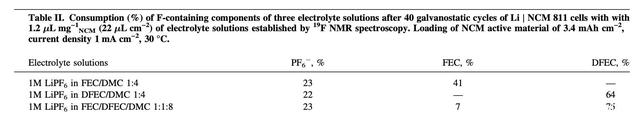 下圖中作者分析了電解液的不同成分的分解情況,從下表中可以看到在經(jīng)過(guò)40次循環(huán)后,F(xiàn)EC基電解液中有41%的FEC發(fā)生了分解,在DFEC基電解液中有64%的DFEC發(fā)生了分解,這表明DFEC更容易發(fā)生分解。在FEC+DFEC混合體系中,DFEC分解了75%,而FEC則只分解了7%,因此作者認(rèn)為在DFEC+FEC混合體系電解液中,DFEC先于FEC發(fā)生分解,產(chǎn)生穩(wěn)定性更好的SEI膜,避免了FEC的大量分解,而FEC則主要起到在循環(huán)修復(fù)SEI膜損傷的作用。