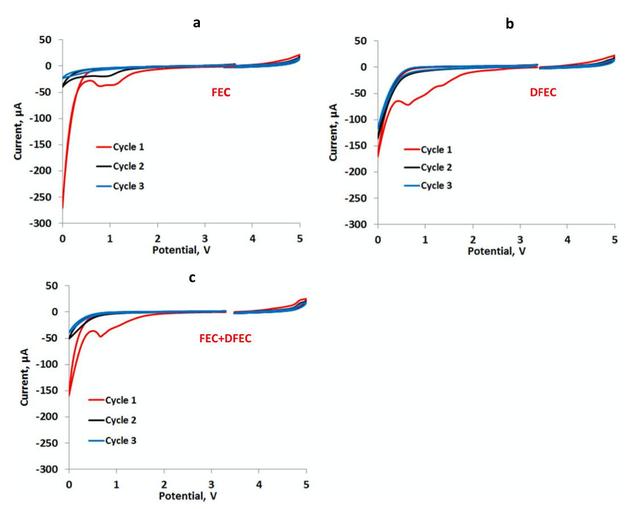 下圖為幾種不同電解液的循環(huán)伏安測(cè)試曲線,可以看到在氧化循環(huán)中電解液都表現(xiàn)出了良好的穩(wěn)定性,在5V的電壓下都沒(méi)有出現(xiàn)明顯的氧化電流峰,在還原掃描過(guò)程中DFEC在2.5V左右開始發(fā)生分解,F(xiàn)EC在2V左右開始發(fā)生分解,這也解釋了為什么DFEC會(huì)先于FEC發(fā)生分解。