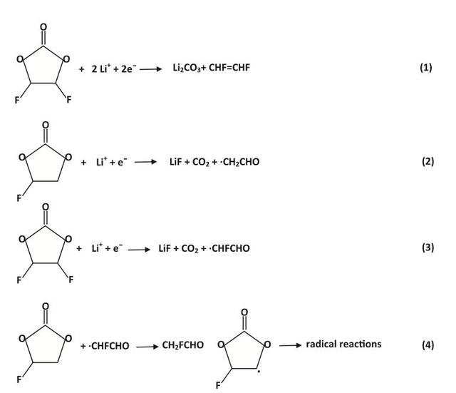 Elena Markevich的研究表明,相比于EC基電解液,F(xiàn)EC基和DFEC基電解液能夠在金屬鋰負(fù)極表面形成有機(jī)、無(wú)機(jī)成分復(fù)合的SEI膜,從而及保證了良好的機(jī)械穩(wěn)定性,也保證了Li+的遷移,從而有效地提升了金屬鋰電池的循環(huán)穩(wěn)定性。同時(shí)FEC+DFEC復(fù)合電解液體系在金屬鋰電池中,DFEC會(huì)首先分解形成穩(wěn)定的SEI膜,減少FEC的分解,剩余的FEC則能夠在循環(huán)中不斷修復(fù)SEI膜的損壞,從而進(jìn)一步提升電池的循環(huán)穩(wěn)定性。