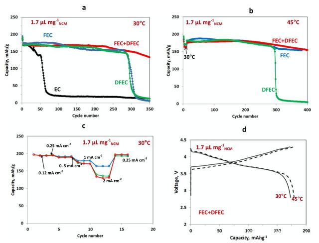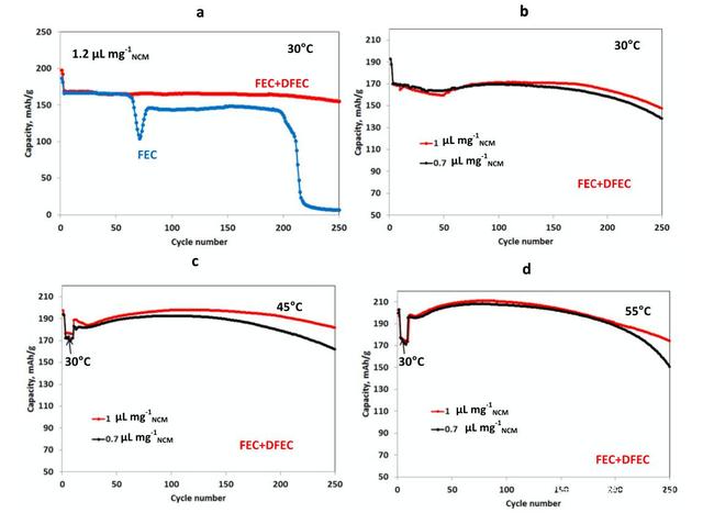 下圖a中展示了在1.7mL/gNCM(10.2g/Ah)的注液量下不同電解液的循環(huán)性能,從圖中能夠看到相比于EC基的電解液,添加FEC和DFEC的電解液循環(huán)性能得到了顯著的提升。在這一較多的電解液添加量下,添加FEC和FEC+DFEC的電解液在前300次都能保持良好的循環(huán)穩(wěn)定性,而FEC+DFEC則在300次循環(huán)后仍然保持了較好的循環(huán)穩(wěn)定性。如果我們將循環(huán)溫度提高到45℃,從下圖b我們能夠觀察到FEC+DFEC混合溶劑電解液仍然保持了最好的循環(huán)性能,