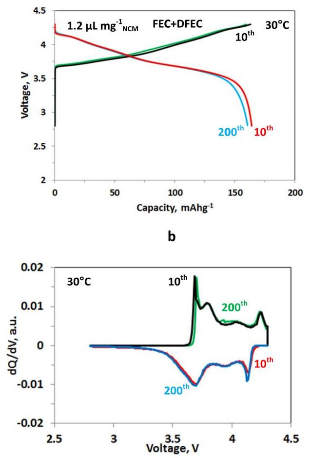 下圖a為采用FE+DFEC體系電解液的電池在開始循環(huán)時(shí)和循環(huán)200次后,電池的充放電曲線,從下圖a可以看到采用FEC+DFEC體系電解液的電池不僅在容量上保持了良好的穩(wěn)定性,電池的充放電電壓也沒(méi)有出現(xiàn)明顯的衰降。同時(shí)從下圖b也可以看到,在經(jīng)過(guò)200次循環(huán)后電池的主要特征峰也沒(méi)有出現(xiàn)明顯的偏移和衰降,這表明NCM電極在長(zhǎng)期的循環(huán)中其表層晶體結(jié)構(gòu)和體相晶體結(jié)構(gòu)沒(méi)有出現(xiàn)明顯的衰降。