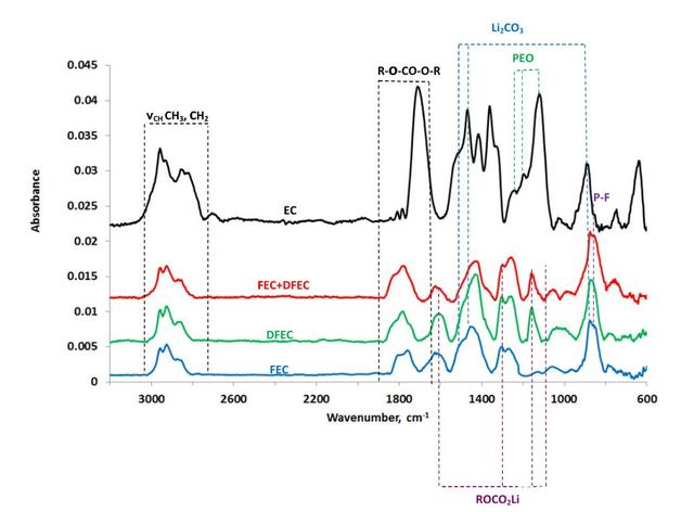 為了分析幾種不同的電解液體系對(duì)于金屬鋰負(fù)極SEI膜的影響,作者采用紅外吸收的方式分析了金屬鋰表面膜的成分(結(jié)果如下圖所示),從圖中我們能夠看到在EC基的電解液中,SEI膜的厚度更厚,并且含有較多的類PEO的聚合物成分,這表明在循環(huán)過(guò)程中EC在金屬鋰表面的還原聚合,是導(dǎo)致金屬鋰電池衰降的主要原因。