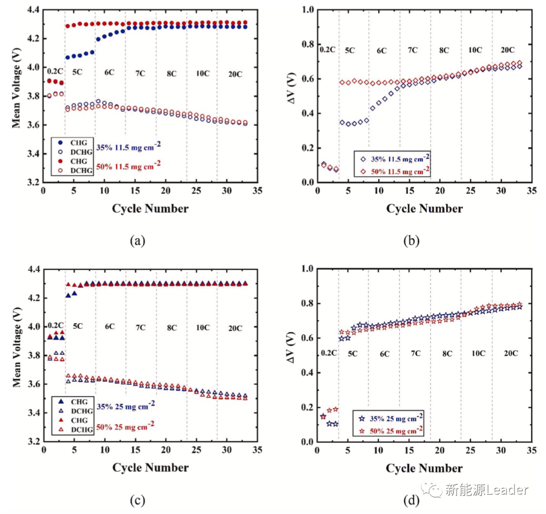下圖為不同涂布量和孔隙率的電極在不同倍率下的平均充放電電壓和充放電電壓之間的差值的變化曲線。從下圖a可以看到在11.5mg/cm2的涂布量下,在0.2C較低倍率下,高低孔隙率的電極的充放電平均電壓基本上式相同的,當(dāng)倍率達(dá)到5C和6C時(shí),能夠觀察到35%孔隙率的電極具有更低的充電平均電壓。當(dāng)電極的涂布量達(dá)到25mg/cm2時(shí),在0.2C倍率下孔隙率為35%的電極具有較低的充電平均電壓和較高的放電平均電壓,但是在5C和6C倍率下,兩種孔隙率電極極化都比較大。從下圖b可以看到兩種孔隙率的電極對(duì)于充放電之間的電壓差有著明顯的影響,在5C倍率下50%孔隙率的電極電壓差為0.57V左右,而35%孔隙率的電極的電壓差則僅為0.36V,但是在更高倍率下這種差距基本消失。在25mg/cm2的涂布量下,兩種孔隙率的電極這種差距則基本消失,這可能是因?yàn)榈屯坎剂康碾姌O的擴(kuò)散長(zhǎng)度接近特征擴(kuò)散長(zhǎng)度,因此孔隙率降低帶來的擴(kuò)散長(zhǎng)度的減少有利于提升倍率性能,但是在較高的涂布量下,擴(kuò)散長(zhǎng)度較長(zhǎng),因此孔隙率變化引起的擴(kuò)散長(zhǎng)度的變化,對(duì)于電極的倍率性能的影響較小。