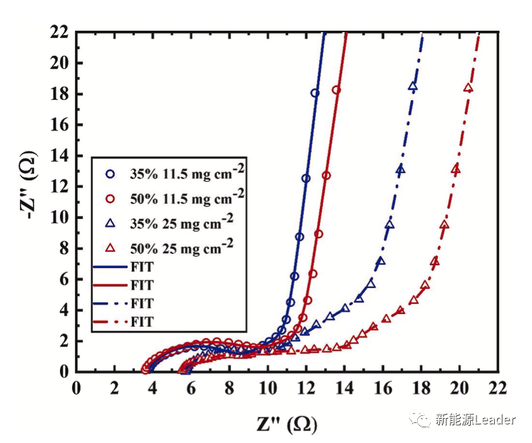 上述的測(cè)試表明,Li+在厚電極內(nèi)的擴(kuò)散過程可能是電池快充能力的限制環(huán)節(jié),在下圖中作者采用EIS工具對(duì)不同涂布量和孔隙率的電極進(jìn)行了分析,作者認(rèn)為在下圖中EIS曲線與X軸的交點(diǎn)為歐姆阻抗,半圓則為正極和集流體的接觸阻抗,半圓后的45度斜率的曲線為電解液在多孔電極內(nèi)的擴(kuò)散曲線,后面更大斜率的曲線則為L(zhǎng)i+的固相擴(kuò)散過程。