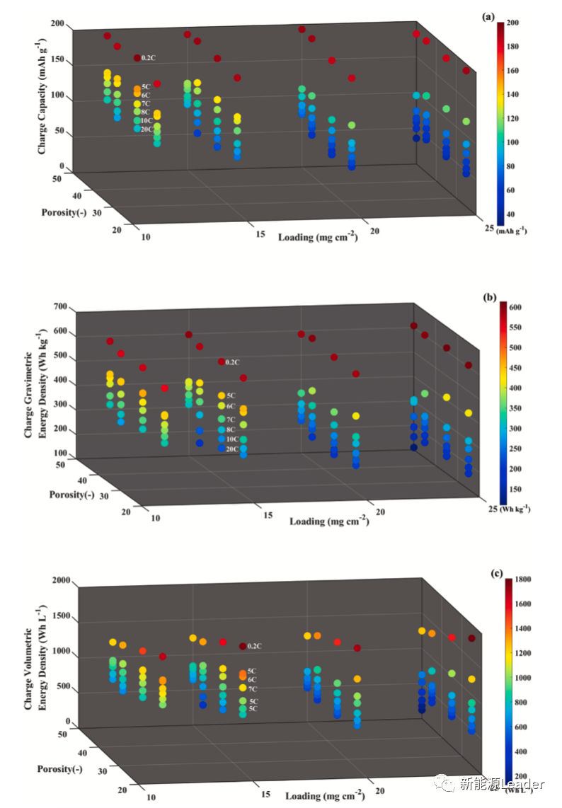 下圖b中則展示不同孔隙率和涂布量條件下,電極整體的能量密度變(活性物質(zhì)+鋁箔)化趨勢(shì),可以看到在0.2C倍率條件下隨著電極涂布量的增加,電極的能量密度呈現(xiàn)上升的趨勢(shì)。但是在5C大倍率下,高涂布量的電極反而能量密度較低,例如在50%孔隙率條件下,11.5mg/cm2的電極能量密度為373Wh/kg,而25mg/cm2的電極能量密度反而只有230Wh/kg。