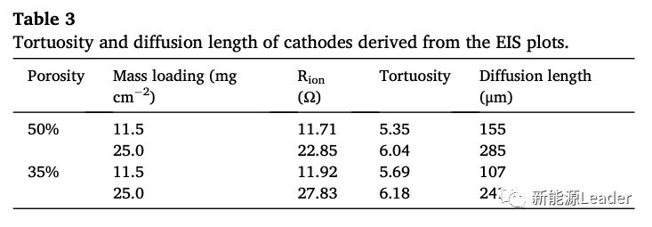 根據(jù)電極的EIS曲線可以看到,高涂布量會(huì)導(dǎo)致電極的歐姆阻抗增加,這主要是因?yàn)楹耠姌O會(huì)增加Li+的擴(kuò)散距離,而擴(kuò)散距離L我們可以通過下式進(jìn)行計(jì)算,下表為計(jì)算結(jié)果。從結(jié)果可以看到涂布量從11.5mg/cm2增加到25mg/cm2,擴(kuò)散距離L增加了基本上一倍左右,同時(shí)電極的孔隙率降低也能夠有效的降低Li+在電極內(nèi)的擴(kuò)散距離。這表明較低的孔隙率雖然會(huì)導(dǎo)致電極的迂曲度增加,但是由于電極的厚度變薄,Li+的擴(kuò)散距離降低,因此反而使得電池的倍率性能得到改善。