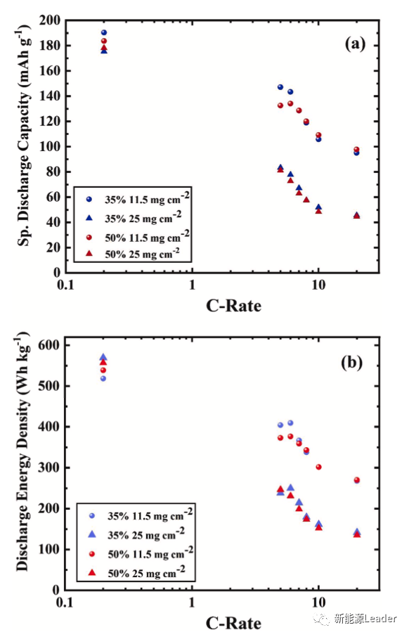 下圖展示了涂布量為11.5和25mg/cm2,電極孔隙率為50%和35%的電極的電性能,從下圖a中可以看到涂布量對(duì)于電極倍率放電的能力有著顯著的影響,涂布量較厚的電極在大倍率下的放電容量要明顯低于涂布量較低的電極。從下圖b可以看到在電極的能量密度方面,在0.2C倍率下厚電極能量密度更高,但是在較高的放電倍率下,反而是涂布量較薄的電極具有最高的能量密度,例如11.5mg/cm2的電極在5C和6C的倍率下電極的能量密度仍然可達(dá)405Wh/kg,遠(yuǎn)高于厚電極的250Wh/kg。