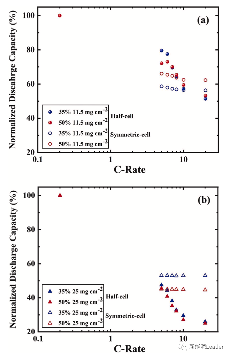 下圖中作者對(duì)比了扣式半電池和對(duì)稱式扣式電池的容量,從下圖a中可以看到在較低的倍率下對(duì)稱式扣式電池的容量較低,這主要是因?yàn)閷?duì)稱式電池的正負(fù)極采用的均為多孔NCM622正極,因此整體上Li+的擴(kuò)散距離要明顯高于采用金屬鋰片的半電池,但是在倍率大于8C時(shí)對(duì)稱式電池則表現(xiàn)出一定的優(yōu)勢(shì),而25mg/cm2的電極則在5C以上倍率時(shí),對(duì)稱式電池就表現(xiàn)出明顯的優(yōu)勢(shì),這表明在大倍率下金屬鋰負(fù)極也會(huì)成為電池倍率性能的限制因素。