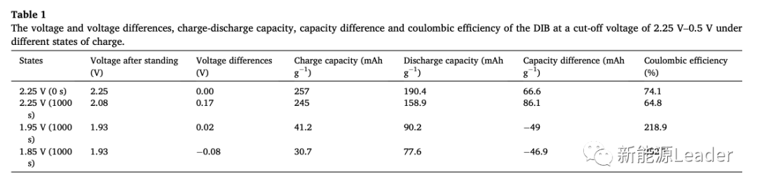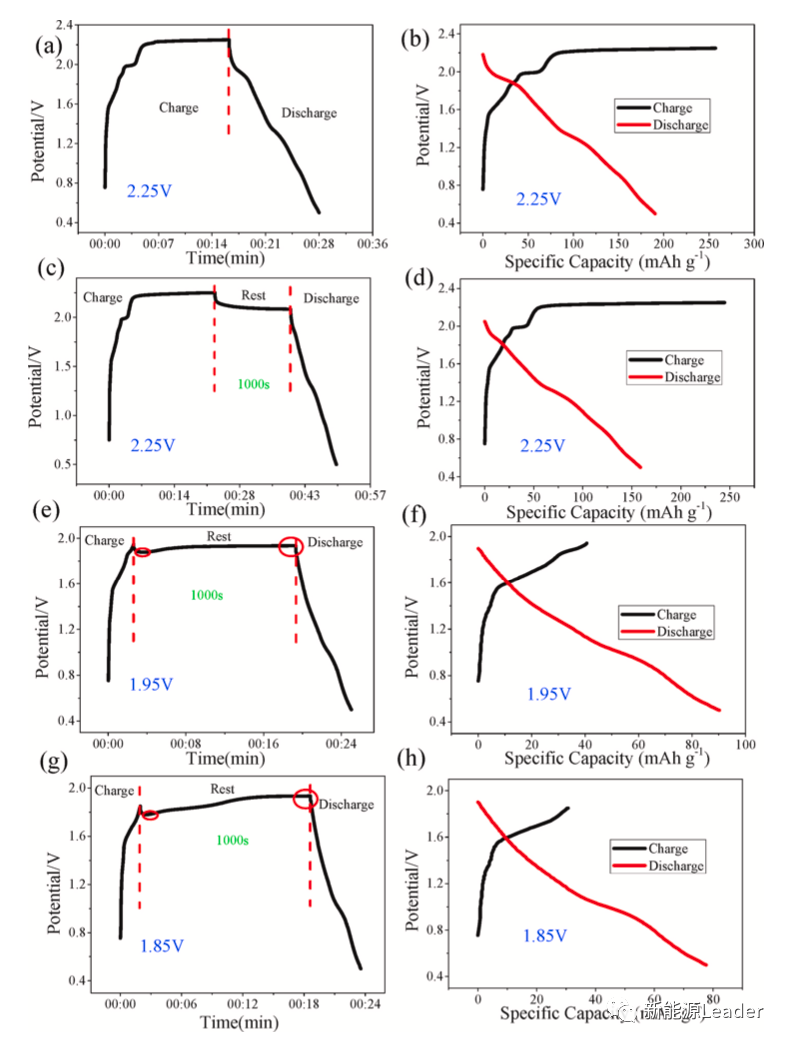 為了研究雙離子電池的自放電機理,作者在不同的截止電壓下進行了自放電測試,下圖a和b分別為截止電壓為2.25V時的時間-電壓和電壓-容量曲線,從下表中的統計數據可以看到,如果充電后直接放電則電池的放電容量為190.4mAh/g,庫倫效率為74.1%,但是如果擱置1000s后再進行放電,電池的電壓會降低到2.08V,放電容量也降低到了158.9mAh/g,庫倫效率也降低到了64.8%,這可能是因為熔鹽電解質的分解(AlCl3 = Al+ 1.5Cl2 (g) 和NaAlCl4 = Al + 1.5Cl2 (g) + NaCl)造成的。如果我們將充電截止電壓控制在1.95V則擱置1000s后的電壓僅降低0.02V,從電壓曲線上也能夠看到電壓呈現先下降后上升的現象,這主要是因為靜置過程中石墨電極吸附電解質中的陰陽離子產生的自充電現象,具體反應為C+n + AlCl−4 →Cn [AlCl4 ] and C+n + Al2Cl−7 →Cn [Al2Cl7 ],由于自充電現象的存在,電池的放電容量增加了49mAh/g,庫倫效率達到了218.9%。在1.85V的截止電壓下也觀察到了同樣的現象,靜置過程中電壓先下降后升高,最終穩定在了1.93V,容量增加了46.9mAh/g,庫倫效率達到了252.7%。