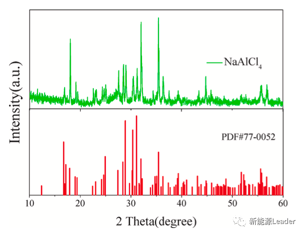 下圖為上述的熔鹽的XRD圖譜,從圖中能夠看到融鹽的主要構成為NaAlCl4,其反應如下式所示。