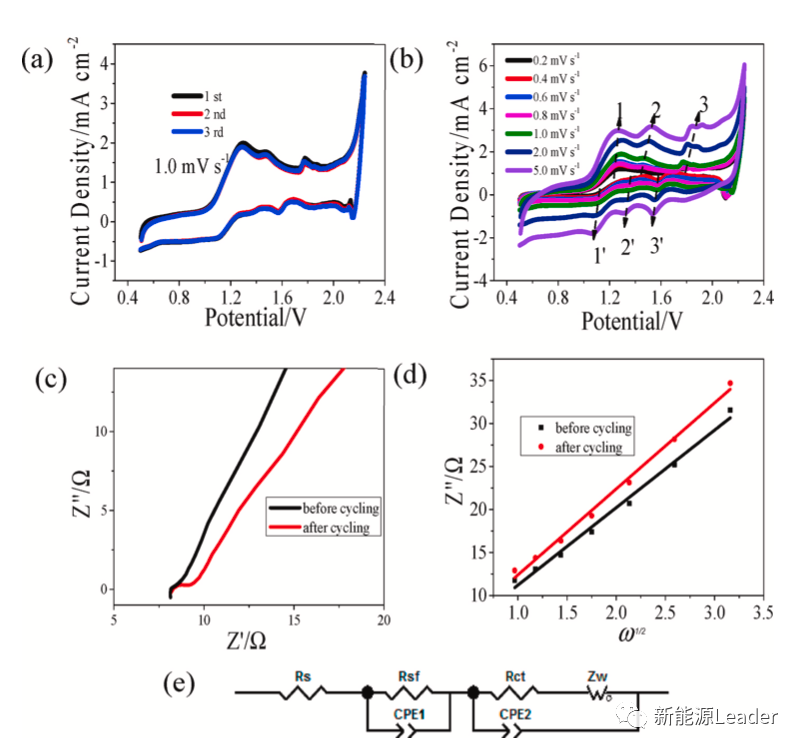 在下圖中作者采用EIS和CV工具對電池進行了分析,從下圖a可以看到,在第1到3次循環中,電池的CV曲線幾乎沒有發生變化。從下圖b中可以看到,在不同的速率下電池都能夠出現3對氧化還原峰,其中1/1’峰主要來自于離子在電極表面的吸附和脫附,在1mV/s的速度下,贗電容貢獻的容量占到總容量的39.6%,隨著掃描速度的增加,贗電容容量占比逐漸增加,在5mV/s的速度下,占比可達53.8%。而2/2’和3/3’峰主要來自于lCl−4和Al2Cl−7的嵌入和脫出。