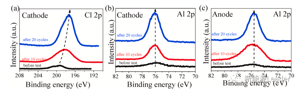 為了進一步分析該電池的反應機理,作者采用XPS工具對經過不同循環的正負極進行了分析,從下圖a可以看到隨著循環次數的增加Cl 2p逐漸向低結合能的方向偏移,并且強度明顯增加,這主要是部分氯鋁酸陰離子在嵌入到石墨材料中后無法脫出,在石墨中積累造成的造成的,這也是為什么雙離子電池的庫倫效率較低。從下圖b中我們注意到Al 2p的結合能沒有出現偏移,但是隨著循環次數的增加,強度出現了明顯的增加。從下圖c中我們也能能夠同樣觀察到負極中Al的含量出現了顯著的增加。