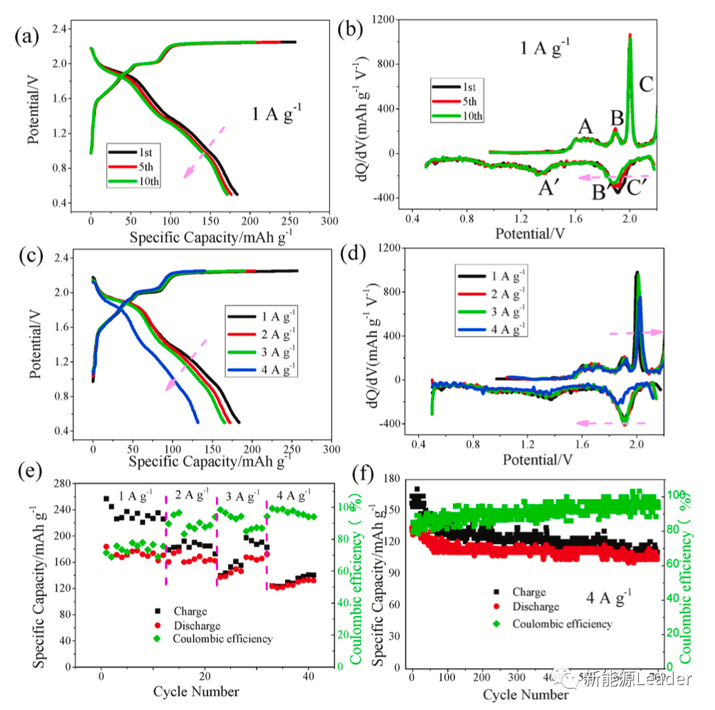 由于該電解質的穩定電化學窗口最高為2.4V,因此作者將充電截止電壓設置為2.25V,從下圖a可以看到在1A/g的電流密度下,在第1、5和10次循環中電池的充電容量分別為256.7mAh/g、236.9mAh/g和206mAh/g,放電容量分別為183.8mAh/g、176.5mAh/g和171.3mAh/g(以正極質量為準),首次的庫倫效率為71.6%,第10次循環時庫倫效率提高到了83.2%。