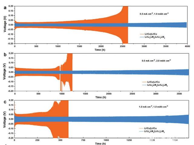 除了能夠存進(jìn)產(chǎn)生均勻的電流密度外,液態(tài)合金也能夠作為金屬鋰與電解液之間的物理屏障,能夠有效的電解液電解液在負(fù)極表面的分解,同時液態(tài)金屬的特性也使得其能夠更好地適應(yīng)金屬鋰負(fù)極在充放電過程中的體積膨脹,從而減少了界面副反應(yīng),也能夠有效地改善電池的循環(huán)性能。