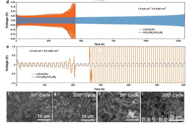 液態(tài)金屬合金這種良好的可逆性使得其具有出色的電化學(xué)性能,在傳統(tǒng)的碳酸脂類電解液體系中,Li/LixLMy/Li/LixLMy對稱式電池,在0.5或1mA/cm2的電流密度下進(jìn)行循環(huán)時,Li/LixLMy電極表現(xiàn)出了出色的循環(huán)穩(wěn)定性,相比于Li/Cu對照組電池,Li/LixLMy電極在長期循環(huán)中電池的極化非常小。從下圖f和g中能夠看到在循環(huán)后Li/LixLMy電極表面仍然維持了無枝晶的狀態(tài),但是普通的金屬鋰電極表面產(chǎn)生了大量的枝晶。