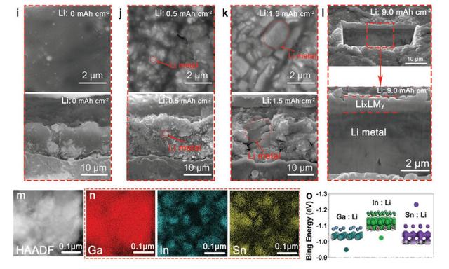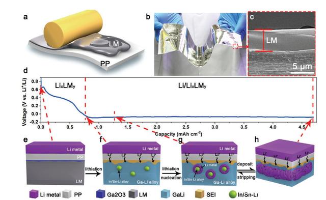 核殼結(jié)構(gòu)的金屬鋰負(fù)極制備過程如下圖所示,首先將液態(tài)金屬(GaInSn)涂布在PP隔膜上,由于液態(tài)金屬對于PP隔膜良好的浸潤性,因此能夠均勻地分布在隔膜的表面,然后將該隔膜與金屬鋰負(fù)極進(jìn)行復(fù)合(如下圖e所示)。在放電的過程中,Li會首先于液態(tài)合金反應(yīng),生成LixLMy,此時電池的電壓降低到了0.01V(如下圖d所示)。作者通過透射電鏡等手段對液態(tài)合金層進(jìn)行研究顯示,在液態(tài)合金層在嵌鋰后出現(xiàn)了成分分離的現(xiàn)象,合金層中出現(xiàn)了獨(dú)立的富Sn/In區(qū)域和富Ga區(qū)域,而Li會優(yōu)先與In/Sn合金結(jié)合,形成SnInLi團(tuán)簇,隨著反應(yīng)的持續(xù)進(jìn)行,納米尺寸的SnInLi團(tuán)簇聚集在一起形成微米尺寸的顆粒,最終形成一層薄膜,這些金屬鋰的外表都有一層GaLi合金外殼。