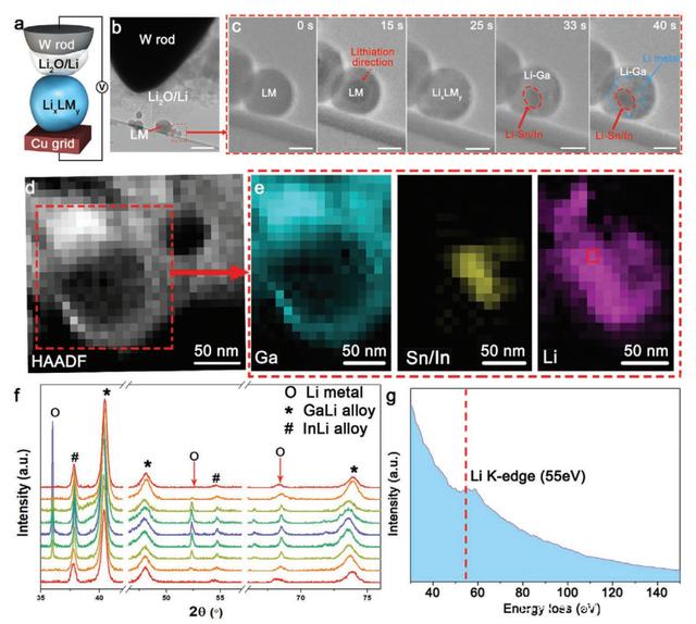 在下圖中作者直接采用透射電鏡對生成LixLMy的過程進(jìn)行了原位觀察,作者設(shè)計了下圖a所示的電池結(jié)構(gòu),其中包含一個涂有金屬鋰的針電極,一滴液態(tài)合金,涂有碳層的銅箔基體。當(dāng)針電極與液態(tài)金屬接觸時,液態(tài)金屬開始發(fā)生嵌鋰,大約在25s后達(dá)到飽和形成LixLMy合金,然后在33s左右金屬鋰開始成核和生長,形成Li/LixLMy成分。上述過程具有非常好的可逆性,從下圖所示的XRD圖譜中能夠看到在開始嵌鋰前,能夠看到GaLi和InLi合金成分的特征峰,隨著嵌鋰的進(jìn)行開始出現(xiàn)金屬鋰的特征峰,并且隨著嵌鋰數(shù)量的增加,這些特征峰的強(qiáng)度也逐漸增強(qiáng),在隨后的脫鋰過程中,這些特征峰的強(qiáng)度又開始逐漸降低,最終徹底消失,液態(tài)合金的特征峰與初始狀態(tài)幾乎相同,表明了液態(tài)合金的嵌鋰過程具有高度的可逆性。