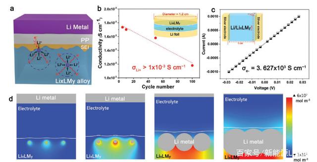 Li/LixLMy電極的這種無枝晶的特性主要來源于兩方面:1)快速導(dǎo)電;2)有效的物理界面,首先GaLi合金具有良好的離子(1×10-3S/cm)和電子(3.63×103S/cm)導(dǎo)電性,因此金屬鋰在沉積的過程中能夠獲得均勻的電流分布,從而有效地抑制了枝晶的產(chǎn)生。