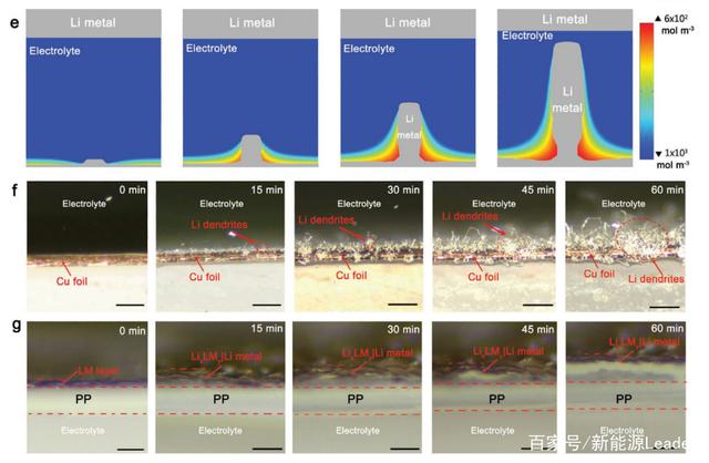 作者在comsol中對金屬鋰的沉積過程進(jìn)行了模擬,在以Cu箔為集流體時,首先在銅箔表面上生成金屬鋰突起物,隨后快速生長為枝晶,而在液態(tài)金屬中時,首先會形成微小的金屬鋰顆粒,然后這些顆粒逐漸生長,并團(tuán)聚在一起生成一層鋰薄膜,從而避免了枝晶的產(chǎn)生。這與下圖f和g中觀察的實驗結(jié)果非常一致。