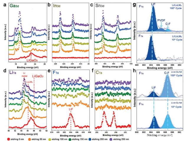 下圖中作者采用逐層刻蝕的方法獲得了在垂直方向上液態(tài)金屬層元素的分布情況,從下圖a-f能夠看到從上而下分別是SEI膜層、LixLMy層和Li/LixLMy混合層。從下圖e可以看到在液態(tài)金屬表層形成的SEI膜具有豐富的LiF,這主要來源于電解液中陰離子的分解。在經(jīng)過循環(huán)后,液態(tài)金屬表層的SEI膜仍然非常穩(wěn)定,從下圖g和h能夠看到在經(jīng)過100次循環(huán)后LiF和C-F的比例幾乎沒有沒有發(fā)生變化。