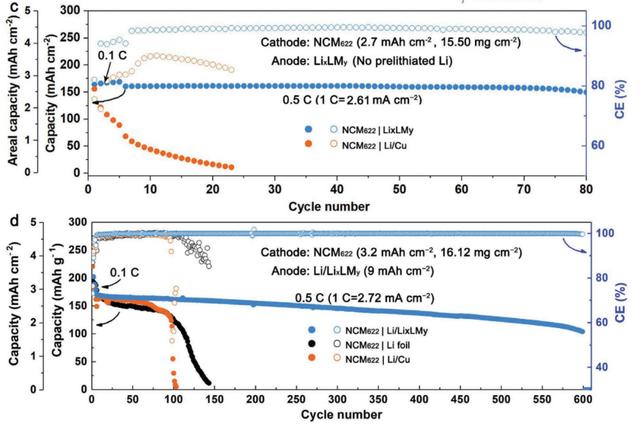 接下來作者采用液態(tài)金屬與NCM622電極(16mg/cm2)一起組成了全電池,由于液態(tài)金屬具有良好的電子導(dǎo)電性,因此其自身可以作為集流結(jié)構(gòu),從而避免了采用銅箔,由于液態(tài)金屬較低的密度,因此能夠有效降低電池的重量。從下圖c可以看到采用該液態(tài)金屬的電極可以穩(wěn)定的循環(huán)超過80次。當(dāng)在液態(tài)金屬中預(yù)先嵌入部分鋰,則能夠進(jìn)一步提升電池的循環(huán)穩(wěn)定性,例如當(dāng)N/P比達(dá)到2.8時,電池循環(huán)500次,仍然能夠保持75%的容量。