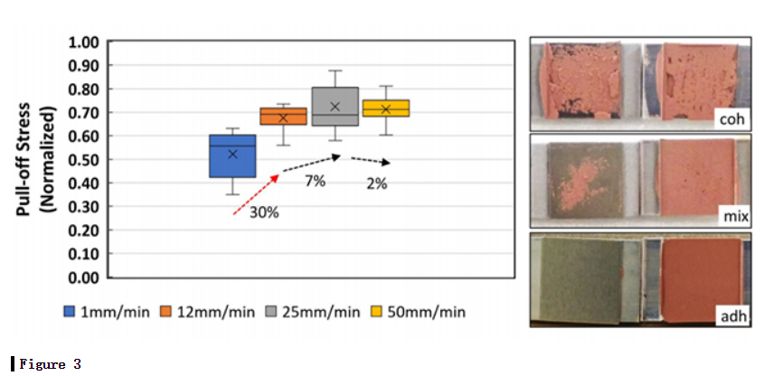 結合聚合物的粘彈性行為,研究人員測量了拉速(應變率)對拉力的影響,結果如圖3所示。粘結間隙保持在1mm不變。很明顯,拉力隨著拉速的增加而增長。然而,在12 mm/min之后,就被測試的間隙填料而言,拉力增加不太明顯,但失效模式明顯不同。在1mm/min時,為粘結性(coh)失效模式。當速度大于或等于12 mm/min時,主要為粘結劑(adh)失效模式,偶有混合(mix)。請參見下圖。