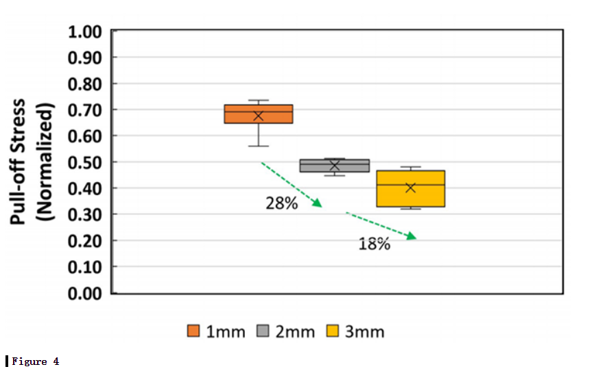 下一個研究變量是粘結層厚度對拉力的影響(圖4)。當結合間隙從1 mm增加到3 mm時,拉力減小。失效模式從1mm時的粘合劑/混合性(adh/mix)失效,完全轉變為2mm和3mm時的粘合劑(adh)失效。