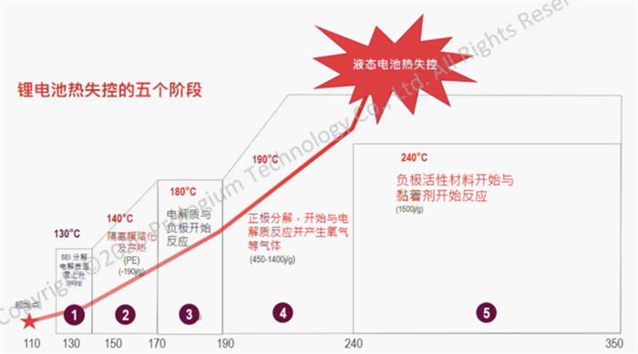 電池熱失控是指電池內部化學反應的產熱速率遠高于散熱速率,大量熱量在電池內部積累導致電池溫度急速上升,最終引起電池起火或爆炸,整個過程大致分為上圖所示的五個階段。一旦觸發熱失控,很難在電池模組及電池包的設計與保護機構層面上阻止,如何在熱失控的化學反應過程中去阻止反應繼續發生,成為了解決熱失控問題的關鍵。