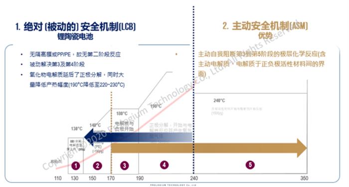根據輝能介紹,“被動”安全指的是固態電池本身的特性,因為無隔膜或PP/PE,故沒有第二階段反應,同時,氧化物電解質延后了正極分解,大幅降低了產熱幅度。在加入了ASM主動安全機制后,第3到第5階段的極層化學反應將自我阻斷,“兩者結合,讓我們能保證模組甚至到電池包都不會有任何熱失控反應發生。而采用了ASM的電芯,連假性熱失控都不會出現。”