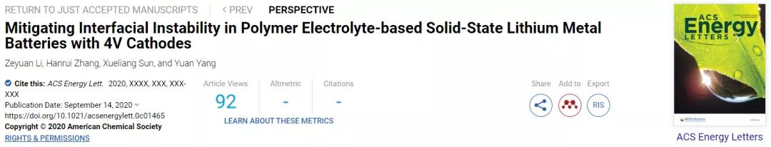 電池組件之間的界面不穩定性阻礙了其實際應用。近日,美國哥倫比亞大學的楊遠教授和加拿大韋仕敦大學的孫學良教授回顧了近年來固態聚合物電解質/電極界面不穩定性方面的研究進展,并對如何進一步理解和解決這些問題提出了一些看法。相關論文以題為“Mitigating Interfacial Instability in Polymer Electrolyte-based Solid-State Lithium Metal Batteries with 4V Cathodes”于9月14日發表在ACS Energy Letters。
