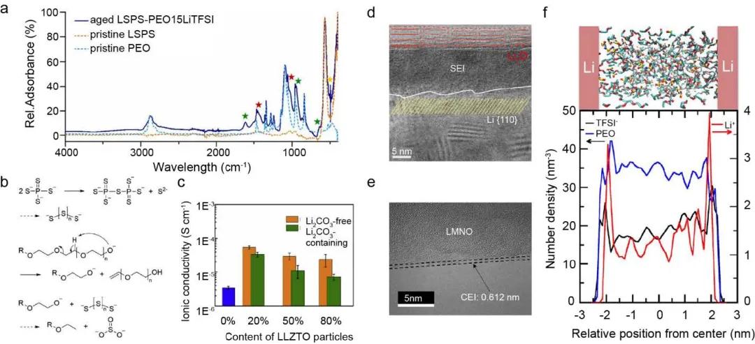 最近,Riphaus等人研究了PEO與Li10SnP2S12(LSPS)之間的界面。他們認為PEO和LSPS之間的化學反應導致復合電解液的阻抗增大。另外他們還認為PEO末端的-OH基團促進了LSP分解形成亞硫酸鹽(圖4b)。