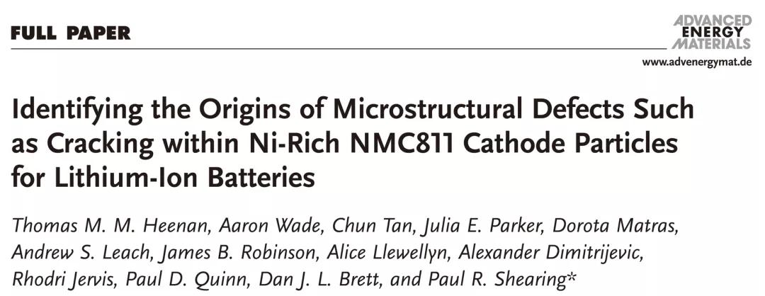 電極材料晶體學(xué)、材料宏觀結(jié)構(gòu)及材料電化學(xué)性能三者間的關(guān)系錯(cuò)綜復(fù)雜,跨越由微觀到宏觀多個(gè)尺度。從原子尺度出發(fā),材料循環(huán)過程中引發(fā)的Ni-Li反位點(diǎn)缺陷被認(rèn)為是NMC811顆粒間碎裂的主要原因,這種由晶體結(jié)構(gòu)變化引起的初級(jí)顆粒位錯(cuò)會(huì)進(jìn)而導(dǎo)致次級(jí)顆粒間出現(xiàn)裂痕,最終使得材料在充放電過程中層間距增大,塊體碎裂,失去電接觸。而Mn元素的引入可以大大提高Ni在晶格中的穩(wěn)定性,但Mn在循環(huán)中的溶解現(xiàn)象是否會(huì)對(duì)NMC811電池產(chǎn)生影響,又是否是材料出現(xiàn)裂痕的根源呢?近日,倫敦大學(xué)學(xué)院的Paul R. Shearing教授在Advanced Energy Materials期刊上發(fā)表了題為“Identifying the Origins of Microstructural Defects Such as Cracking within Ni-Rich NMC811 Cathode Particles for Lithium-Ion Batteries”的文章。該工作深入研究了不同尺度下高鎳三元正極材料(NMC811)在組裝、充放電等各過程的碎裂機(jī)理,從極片水平出發(fā),進(jìn)而深入至顆粒水平,分析初級(jí)/次級(jí)顆粒及電極材料界面的接觸性和循環(huán)過程中顆粒內(nèi)部和顆粒間Ni,Co,Mn含量變化等角度出發(fā),探尋材料缺陷及顆粒裂痕出現(xiàn)的根源。